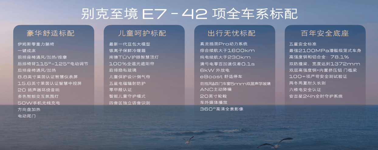 动力系统方面,至境E7搭载真龙插混Pro系统,CLTC纯电续航235km,综合续航1630km。满亏电零百加速差异小于0.1s,亏电巡航车速可达180km/h。底盘配备预瞄式RTD连续阻尼可变悬架,每秒500次扫描路况,200次调节阻尼,搭配eBoost舒适制动系统,有效抑制点头,预防晕车,保护儿童骨骼发育。新车还支持6kW外放电功能,满足户外用电需求。