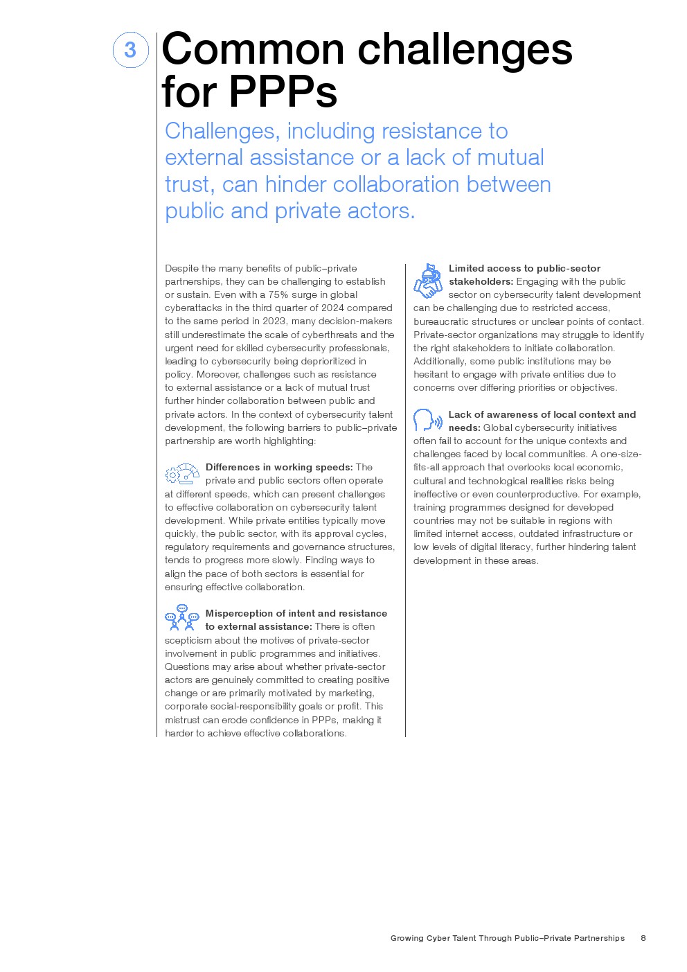 公私合作模式在此背景下成为制度性解决方案。其核心在于资源、风险与能力的再分配,通过公共部门提供政策与基础设施,私营部门提供技术与市场导向,实现成本分摊与效率提升。实践中,该模式已在教育、培训及就业转化环节形成闭环,例如部分项目实现85%毕业生进入高科技行业,显著提升转化效率。但合作机制亦存在摩擦成本。公私部门在决策节奏、目标导向及信任机制上存在差异,同时对本地需求认知不足,使部分项目难以落地或规模化。此外,治理结构不清晰与绩效指标缺失,也会削弱长期效果。