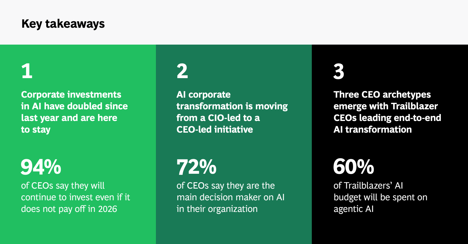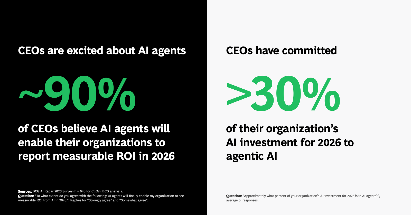 AI智能体正成为下一阶段核心驱动力,约90%的CEO认为其将在2026年带来可量化回报,且平均超过30%的AI预算已指向该领域