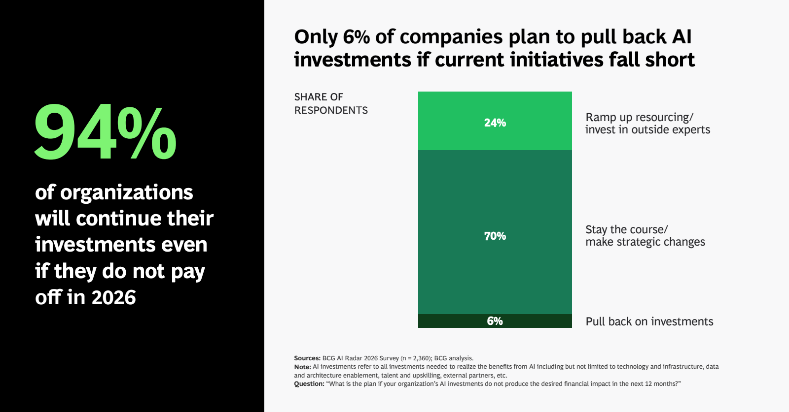 94%的企业即便短期未实现预期回报仍将持续投入,仅6%计划削减预算,反映出AI已从试验性支出转向长期战略资本配置。