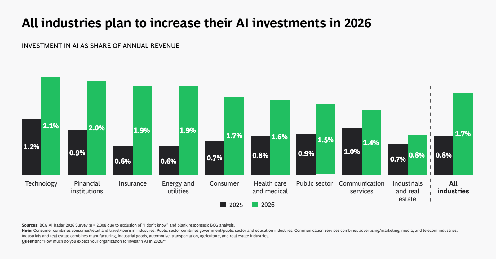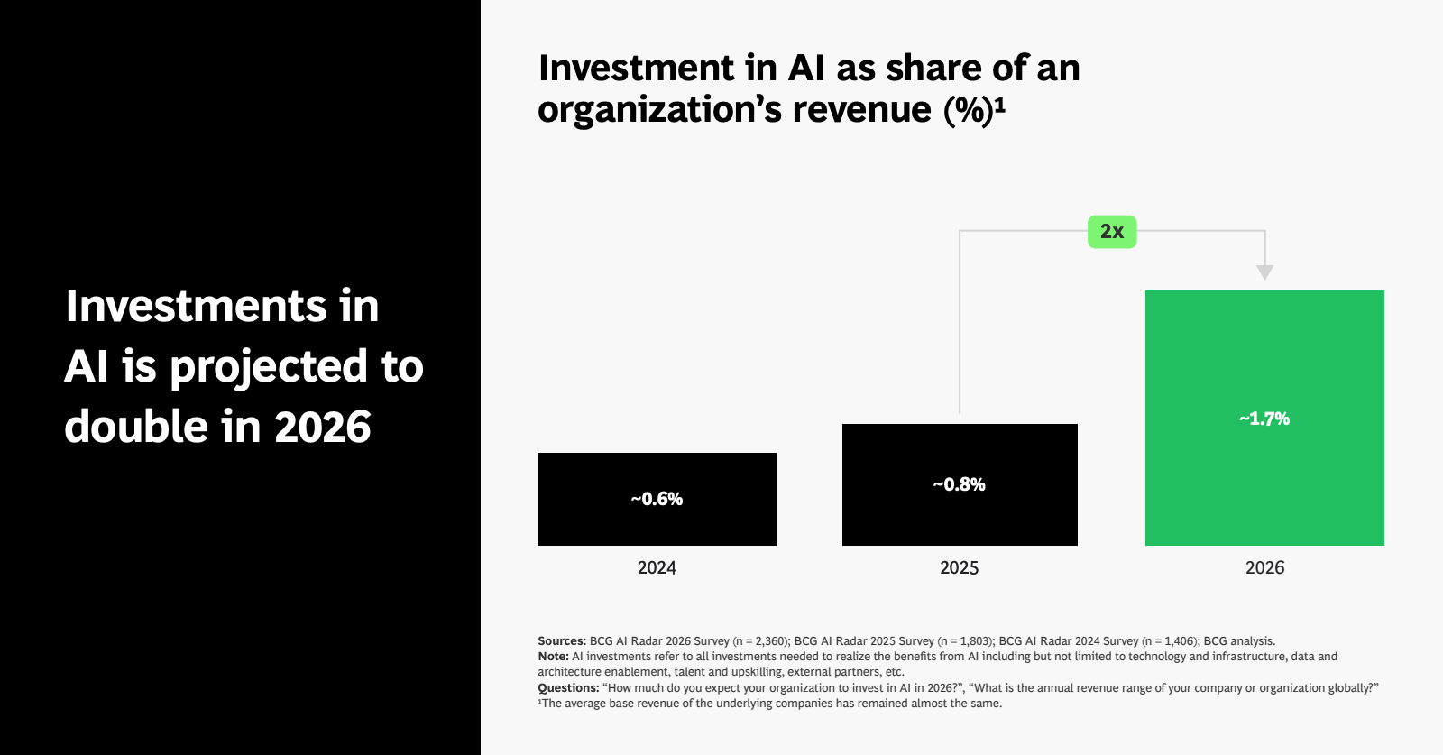 企业层面的AI投入正呈现加速扩张态势,数据显示2026年AI投资占企业收入比重预计达1.7%,较2025年约0.8%实现翻倍增长,延续过去三年的持续上升趋势。