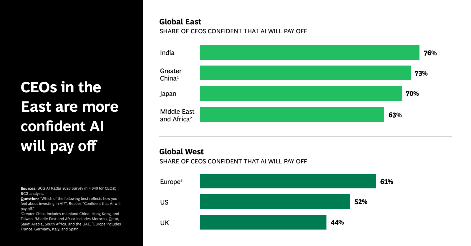 区域差异同样显著,印度、大中华区及中东地区CEO对AI回报的信心分别达到76%、73%与63%,显著高于欧美市场
