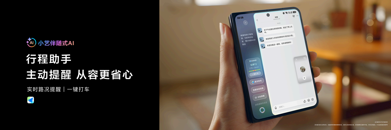• 智慧出行,贴心护航:小艺伴随式 AI 与高德地图、滴滴出行等生态伙伴联合创新体验,比如在出发前,在小艺伴随式 AI 中,高德地图会根据用户行程以及实时路况信息,进行最佳出发提醒和路线规划;当用户飞机落地机场、火车到站时,滴滴出行会主动告知用户当前接驾时长,点击卡片即可一键打车。旅程贴心护航,出行更省心。