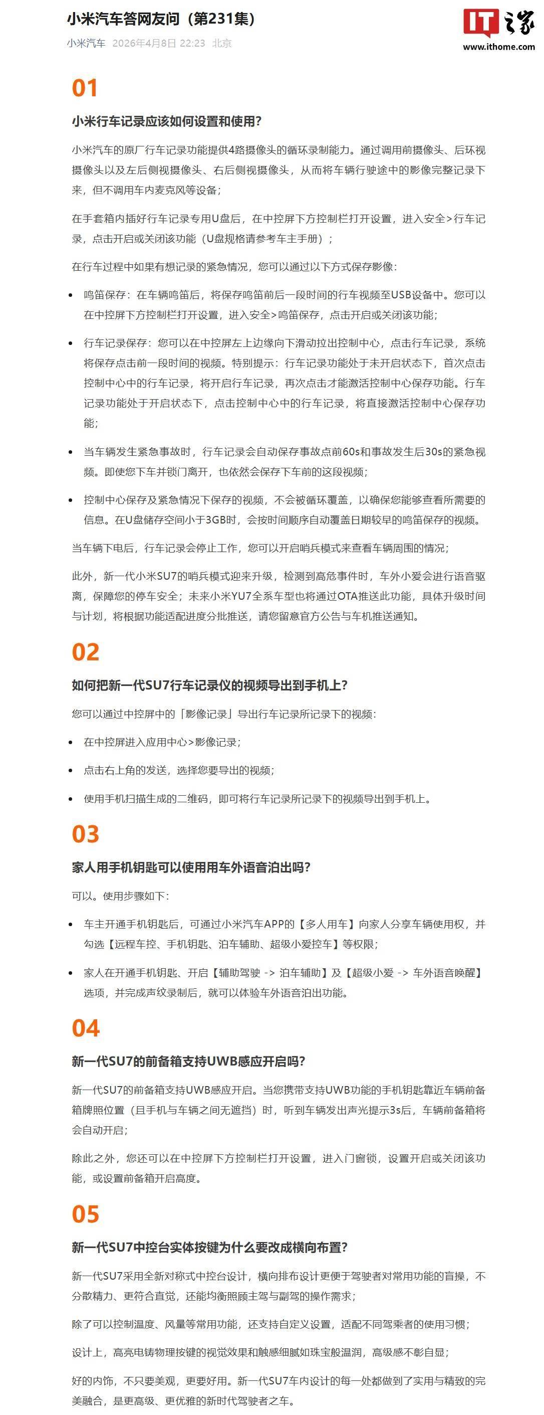 小米汽车近日通过官方渠道发布了最新一期“答网友问”,针对用户关心的行车记录仪设置、视频导出及车辆功能使用等问题进行了详细解答,为车主提供了全面的操作指南。在行车记录功能方面,小米汽车原厂系统支持四路摄像头同步循环录制,覆盖前摄像头、后环视摄像头及左右后侧视摄像头,可完整记录车辆行驶过程中的影像,但不会调用车内麦克风等设备。用户需在手套箱内插入专用U盘(规格参考车主手册),通过中控屏下方控制栏进入“