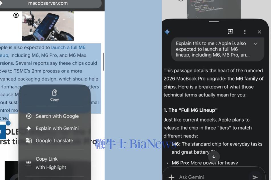 AIPress.com.cn报道3月23日消息,谷歌正在为IOS版Chrome测试新的Gemini交互方式。用户在网页中选中任意文本后,可通过菜单中的“Explain with Gemini(用Gemini解释)”选项直接获取AI解读,无需输入提示词或离开当前页面。该功能目前通过名为“#explain-gemini-edit-menu”的实验标志进行测试,仅向部分用户开放。启用后,当用户高亮选中网