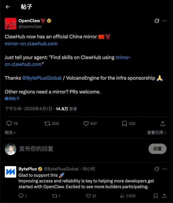 4月2日,在AI创新巡展·武汉站上,火山引擎宣布和OpenClaw共建“ClawHub中国镜像站”,中国地区的开发者使用该站可以解决高频访问源站Skills带来的及时性和稳定性等问题,提升养虾效率和体验。OpenClaw在X平台官宣:在火山引擎的支持下,ClawHub中国镜像站正式启动运营!点击 http://mirror-cn.clawhub.com/ 可以直接跳转到该镜像站。“ClawHub镜