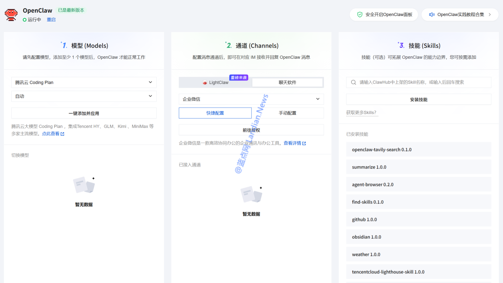 #软件资讯 腾讯企业微信推出 OpenClaw 快速配置,只需扫码即可快速创建机器人并完成绑定,无需手动申请和填写 ID/KEY。这是企业微信与腾讯云合作改进后的流程,用户选购腾讯云 99 元或 199 元 / 年的服务器并安装腾讯云提供的 OpenClaw 应用镜像即可,后续配对过程都非常简单。查看全文:https://ourl.co/112252企业微信日前与腾讯云合作改进 OpenClaw