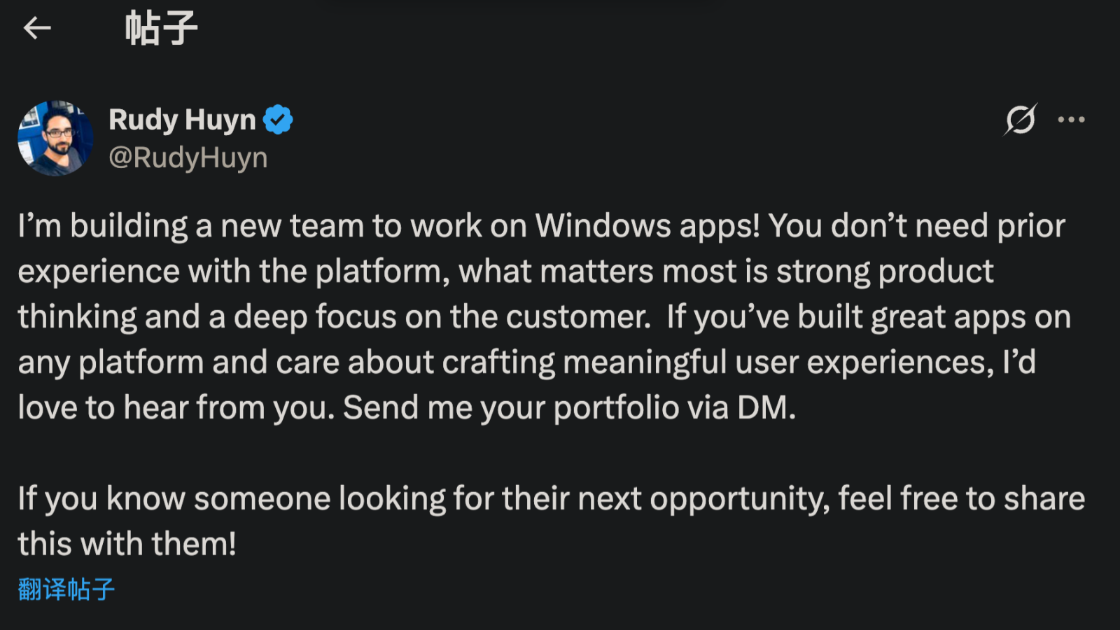#系统资讯 微软正在组建新团队开发 100% 原生应用,但可能仅限于新应用,现有应用估计还会保持原状。负责微软应用商店和资源管理器的合作伙伴架构师鲁迪胡因日前在 X 上招募工程师组建新团队,鲁迪胡因称要开发新的 100% 原生应用,不过暂时鲁迪并未透露是什么应用。查看全文:https://ourl.co/112397早前微软发布博客宣布要在 2026 年提高 Windows 11 系统的可靠性和稳