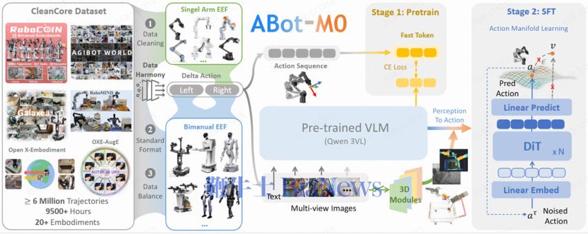 近日,高德宣布正式全量开源ABot-M0——全球首个基于统一架构的机器人具身操作基座模型,可实现一个“通用大脑”适配多种形态的具身机器人。据悉,该模型在Libero、Libero-Plus、RoboCasa等多个权威基准测试中实现SOTA。其中在Libero-Plus基准上,该模型的任务成功率达80.5%,较业界此前的标杆方案Pi0提升近30%。ABot-M0模型架构图此次ABot-M0的开源涵盖