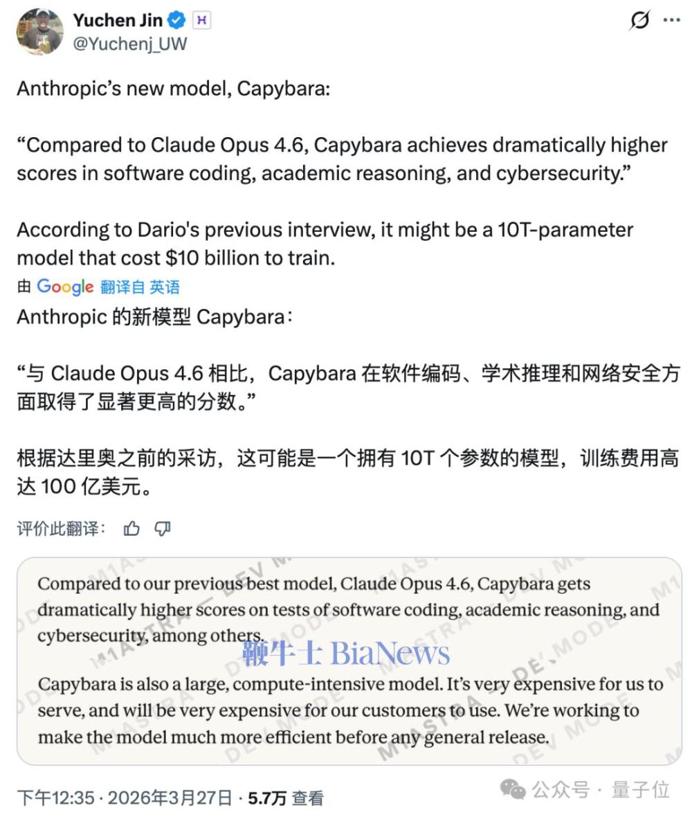 抓马!向来标榜安全的Claude,竟然把自家模型泄露了!?新模型代号“Mythos”,又叫“Capybara(卡皮巴拉)”,比当下Claude最强的Opus模型还大还强。甚是离谱的是,这波曝光,甚至不是外部攻击,而是一次权限配置失误。一篇Anthropic自家博客草稿,被错误设为公开,于是,这只“卡皮巴拉”就这么水灵灵地被全网围观了。更让人绷不住的是,CEO也没能逃过这场风波,他的度假计划,也被这