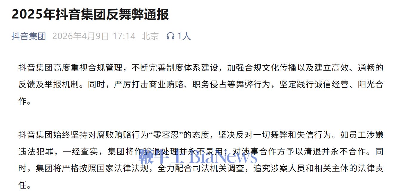 4月9日,抖音集团今日发布2025年反舞弊通报。抖音集团表示,始终坚持对腐败贿赂行为“零容忍”的态度,坚决反对一切舞弊和失信行为。如员工涉嫌违法犯罪,一经查实,集团将作辞退处理并永不录用;对涉事合作方予以清退并永不合作。同时,集团将严格按照国家法律法规,全力配合司法机关调查,追究涉案人员和相关主体的法律责任。2025年,共有五十余人因涉嫌违法犯罪被移送司法机关处理。现将因商业贿赂、舞弊或职务侵占等