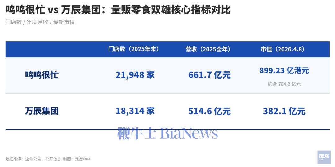 量贩零食双巨头的2025年财报先后落地。鸣鸣很忙上市后首次披露全年业绩,外界第一次看清这家行业老大的真实体量;万辰集团则交出了甩掉食用菌标签后的第一份纯量贩成绩单。两份财报放在一起看,行业规模还在狂奔。2025年,鸣鸣很忙以21948家门店、661.7亿元营收登顶,万辰集团以18314家门店、514.6亿元营收紧随其后,二者合计占据75.5%市场份额。截至4月8日收盘,鸣鸣很忙市值为784.2亿元
