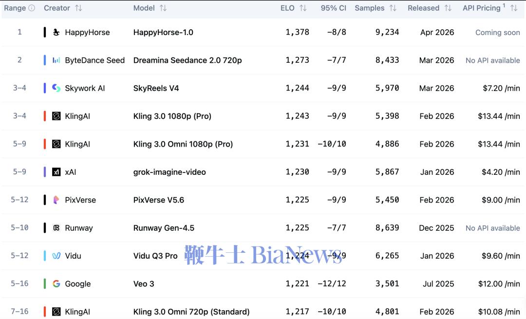 一匹匿名黑马,成为了AI视频圈最热的话题。近日,Artificial Analysis的视频竞技场排行榜更新。一个从未出现过的名字——HappyHorse-1.0,同时出现在四个子榜单的前两位:截至4月9日中午,文生视频(无音频)赛道Elo1378分,领先第二名Seedance2.0整整105分;图生视频(无音频)赛道Elo1411分,刷新全平台历史最高纪录。在带音频的赛道上,它以1分和2分的微弱