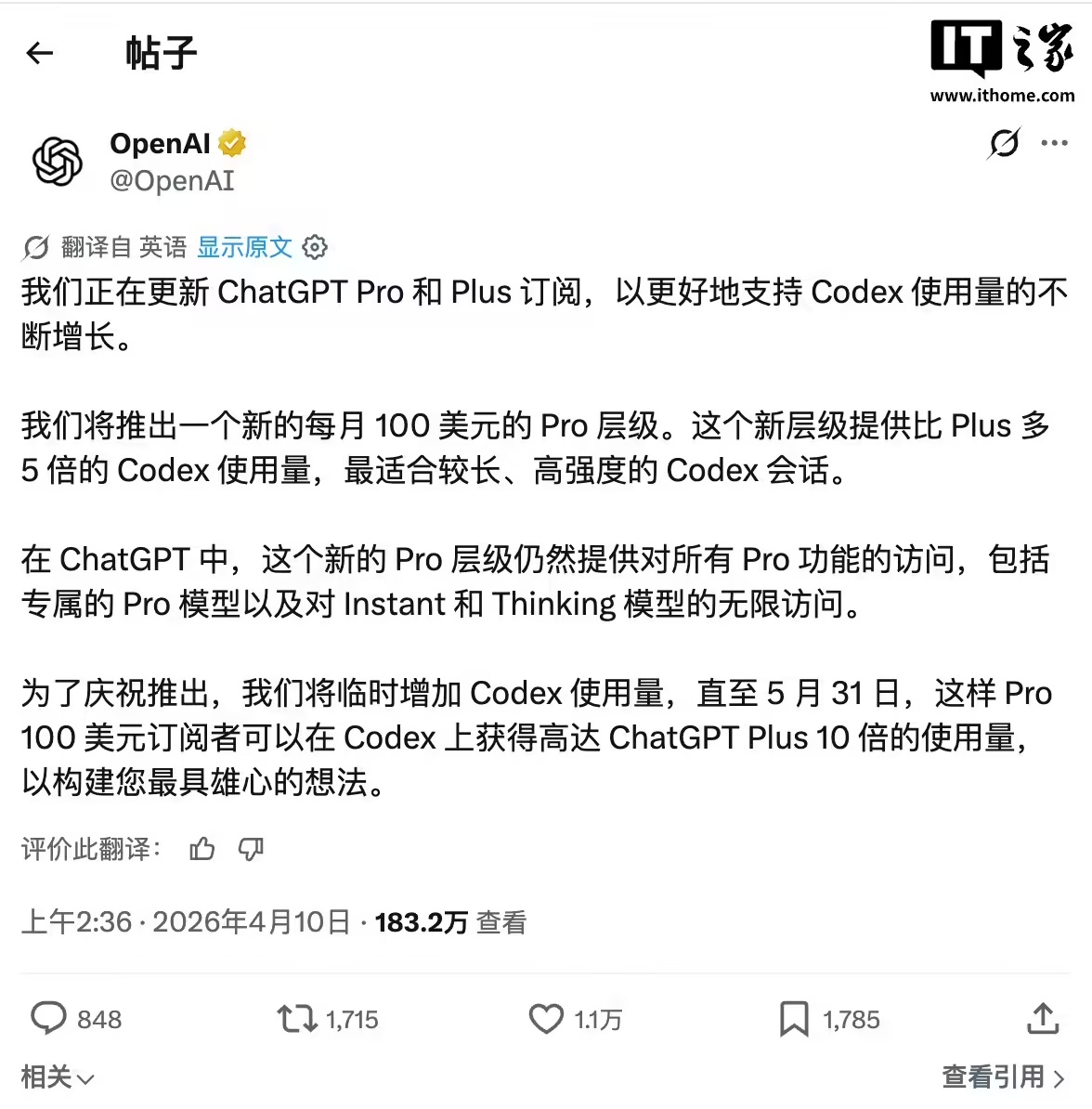 4 月 10 日消息,北京时间今天(4 月 10 日)凌晨,OpenAI 宣布推出每月 100 美元(IT之家注:现汇率约合 684.4 元人民币)的全新订阅方案,填补了原有定价体系中 20 美元与 200 美元之间的空档。这一档位,正是长期以来高频用户所期待的。此前,OpenAI 的订阅分为免费版(含广告)、8 美元 Go 套餐(含广告)、20 美元 Plus(无广告)以及 200 美元 Pro