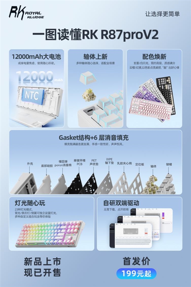 4月8日,RK全新推出R87 ProV2高性能电竞级三模机械键盘,延续百万销量爆品R系列ID设计经典传承,聚焦极致性价比与全能使用体验,以百元价位实现客制化满配电竞性能配置,重新定义入门级机械键盘品质标杆,为学生党、电竞玩家及职场人士带来优质输入体验。此外,首发期间享限时优惠价,购买即赠送RK定制鼠标垫一张,诚意满满。 作为RK主打亲民价位的迭代力作,R87 ProV2真正做到了基础款的价格,旗舰