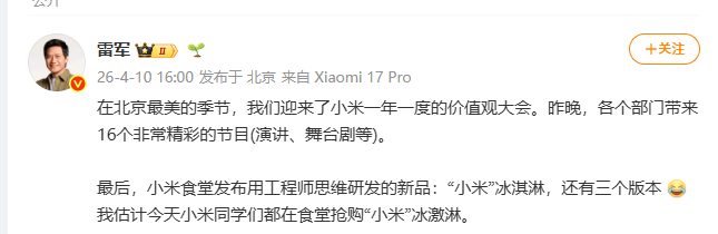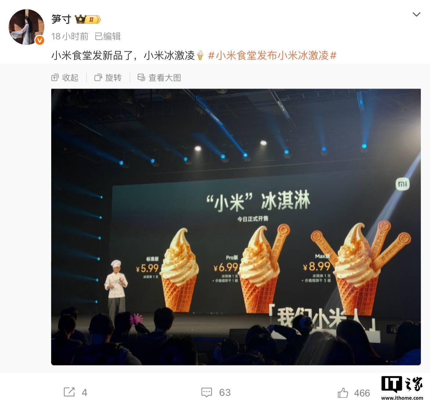 近日,小米公司内部食堂推出的一款新品引发了社交媒体上的广泛关注。这款名为“小米冰淇淋”的甜品,在小米近期举办的“2026价值观大会”上首次亮相,迅速成为员工热议的焦点。据悉,小米冰淇淋共推出标准版、Pro版和Max版三种规格,价格分别为5.99元、6.99元和8.99元。不过,这款新品目前仅面向小米公司内部员工销售,并未对外公开售卖。小米REDMI产品经理“笋寸”在社交媒体上分享了大会现场照片,并