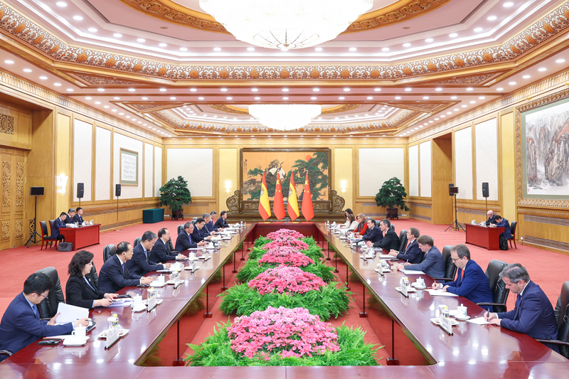 国务院总理李强4月11日下午在北京人民大会堂同来华访问的西班牙首相桑切斯举行会谈。李强表示,近年来,中国和西班牙各领域合作扎实推进,为各自经济稳健增长提供了有力支撑。这充分表明,相互尊重、开放合作、互利共赢是国与国交往的正确之道。今天上午,习近平主席同首相先生举行会晤,为进一步深化两国关系与合作擘画了蓝图。中方愿同西班牙携手努力,在变乱交织的国际局势中秉持开放务实态度,推动两国全方位合作迈上新台阶