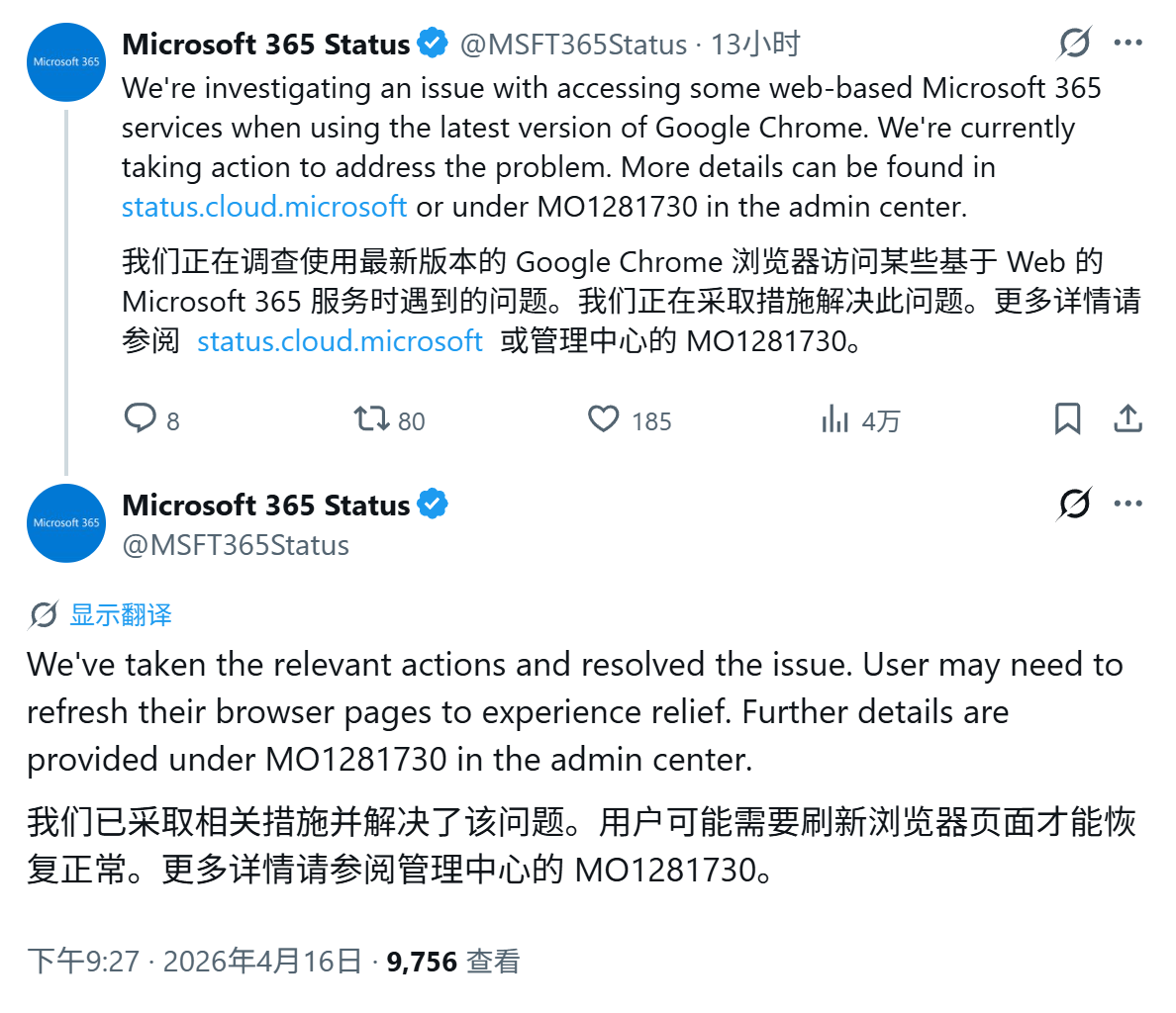 IT之家 4 月 17 日消息,科技媒体 BornCity 今天(4 月 17 日)发布博文,微软在 17 个小时内,紧急修复 Chrome 147 浏览器无法正常使用 Microsoft 365 服务问题。根据官方发布的紧急通知,微软确认部分 Chrome 147 浏览器用户无法访问 Microsoft 365 服务,问题涵盖 Microsoft 365 管理中心无法正常加载界面元素、无法通过网