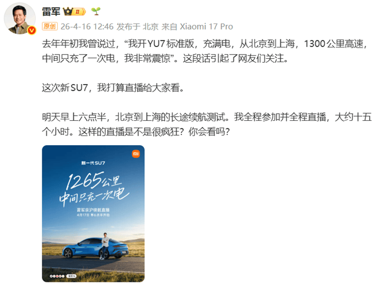 小米创始人雷军即将开启一场备受瞩目的长途驾驶直播挑战。此次,他将驾驶小米新一代SU7从北京出发前往上海,全程预计耗时15小时,并计划进行全程直播,这一消息引发了广泛关注。去年,雷军在直播间曾表示,驾驶小米某款车型从北京到上海1300公里的高速行程中,中间仅充了一次电。这一说法当时就引发了网友的热烈讨论,不少人指出,出发前其实已经充过一次电,严格来说1300公里的行程中总共充了两次电,雷军只强调中间