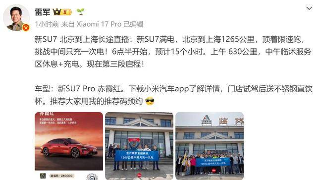 小米集团董事长兼CEO雷军近日亲自驾驶小米SU7 Pro完成了一场跨越京沪的长途续航挑战。这场从北京出发、终点设在上海的测试全程仅充电一次,最终以1313公里的实际行驶里程和剩余19公里续航的成绩,成功验证了车辆的长途续航能力。据直播记录显示,雷军团队于清晨6时35分从北京启程,途经15小时连续驾驶后,于当晚21时40分抵达上海金桥的小米5G未来中心。途中仅在沪芦高速康桥收费站进行一次补能,ETC