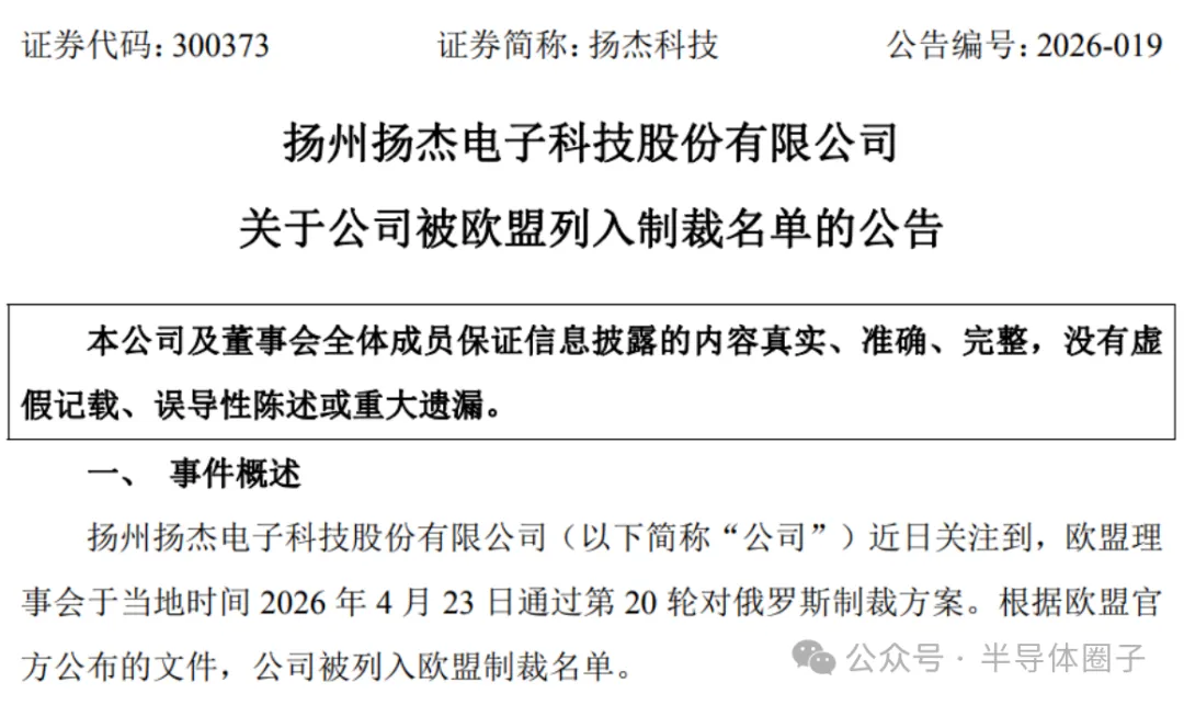 免责声明:本号内容仅作交流学习,非商用,侵权可联系15150147049微信删除,未经允许禁止转载,违者将依法追究相4月27日午间,国产功率半导体厂商扬杰科技发布公告称,近日关注到,欧盟理事会于当地时间 2026 年 4 月 23 日通过第 20 轮对俄罗斯制裁方案。根据欧盟官方公布的文件,公司被列入欧盟制裁名单。对此,扬杰科技表示,公司所有产品的研发与生产,均严格遵循民用领域与工业领域的强制性标