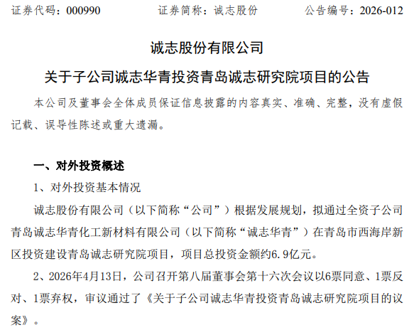 4月15日,诚志股份公告,根据发展规划,公司拟通过全资子公司青岛诚志华青化工新材料有限公司(以下简称“诚志华青”)在青岛市西海岸新区投资建设青岛诚志研究院项目,项目总投资金额约6.9亿元。项目预计建设期为3年,目前处于项目前期报批阶段。项目拟建设以科研楼为主体的研究设施,主要包括有机合成实验室、聚合实验室、材料实验室、加工实验室、分离精制实验室、分析测试实验室,以及办公楼,培训楼,宿舍楼等其他配套