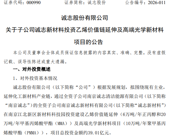 4月15日晚间,诚志股份(SZ000990)发布公告,近日举行的董事会上审议通过孙公司南京诚志新材料有限公司(以下简称:诚志新材料)拟在南京江北新区投资建设的乙烯价值链延伸及高端光学新材料项目。该项目总投资约39.01亿元。建设周期预计为2.5年,资金来源为自有及自筹资金。从项目结构来看,该项目明确指向高附加值新材料领域的升级布局,其中,乙烯价值链延伸项目包括:年产6万吨正丙醇、年产20万吨甲基丙