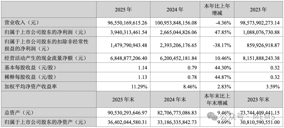 转载来源:MEMS公众号据麦姆斯咨询报道,4月23日晚,歌尔股份发布2025年年度报告:公司营业收入为965.50亿元,同比下降4.36%;归母净利润为39.40亿元,同比增长47.85%;扣非归母净利润为14.80亿元,同比下降38.17%;基本每股收益1.14元;研发投入50.26亿元,占营业收入的比重为5.21%,歌尔股份主营业务包括精密零组件业务、智能声学整机业务和智能硬件业务。其中,精密