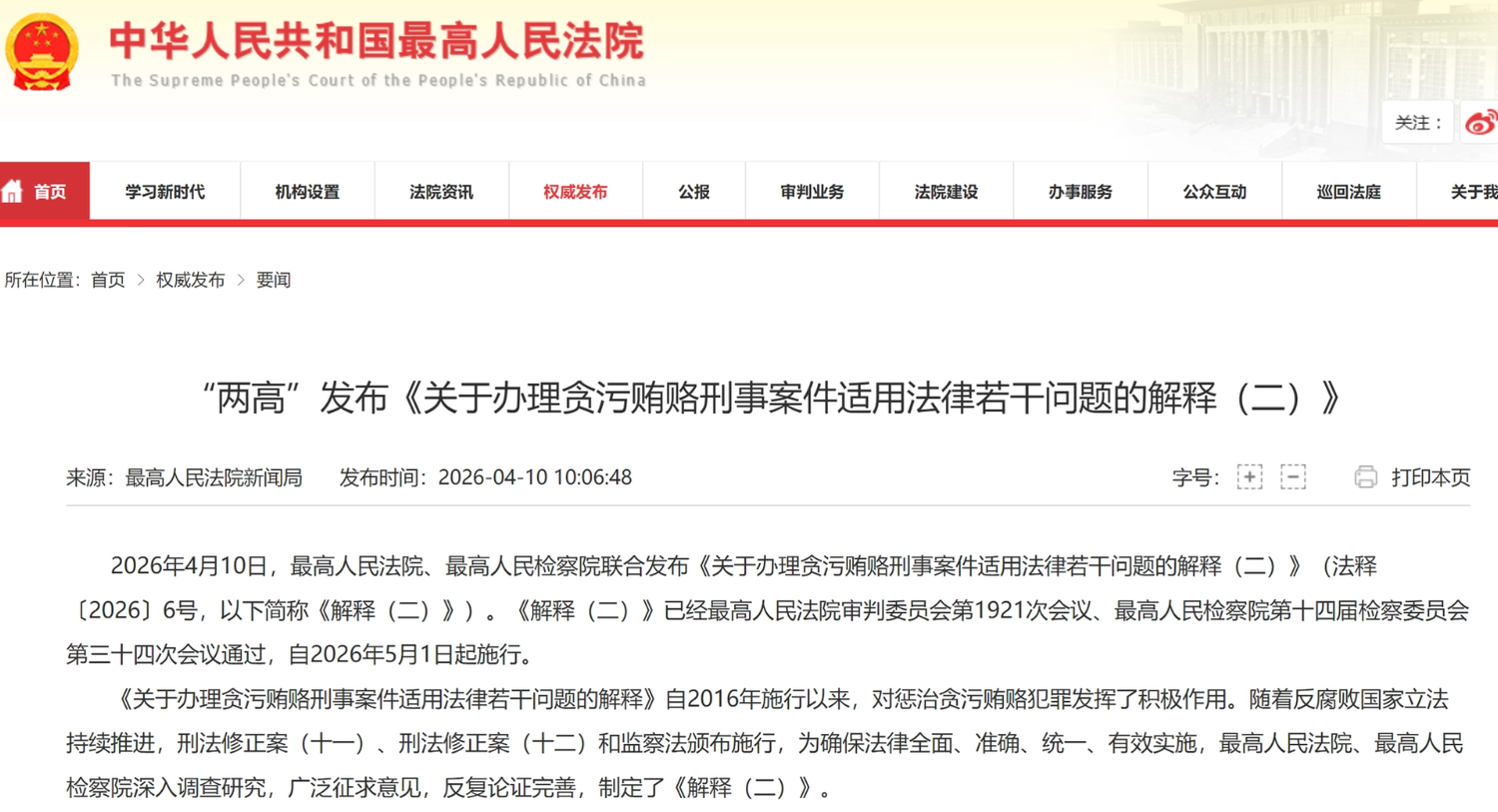 图源:中华人民共和国最高人民法院官网据报道2026年4月10日,最高人民法院、最高人民检察院(以下简称"两高")联合发布《关于办理贪污贿赂刑事案件适用法律若干问题的解释(二)》(法释〔2026〕6号,下称《解释(二)》),自2026年5月1日起施行。这是在2016年相关司法解释基础上,结合新立法和司法实践新情况作出的进一步细化完善,涉及医疗等领域行贿认定规则。《解释(二)》在对单位行贿罪、单位行贿