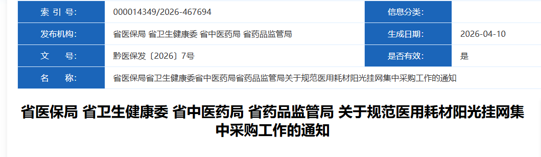 图片来源:相关意见稿 整理4月10日,贵州省医保局官网发布《关于规范医用耗材阳光挂网集中采购工作的通知》,该《通知》自 2026年6月1日 起施行。本次《通知》围绕 采购范围、挂网条件、采购方式、管理机制 等核心内容作出规范调整, 明确要求全省所有公立医疗机构全面参与医用耗材阳光采购及网上公开交易 ;定点非公立医疗机构也应积极 参与医用耗材网上阳光采购,或主动开展线上查价、比价工作。 贵州省将挂网
