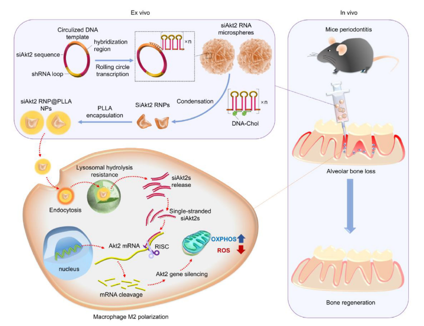 在组织再生领域,巨噬细胞的极化状态直接决定修复结局 —— 促炎 M1 表型加剧组织损伤,而促再生 M2 表型则为修复创造理想微环境。如何高效、精准地诱导巨噬细胞从 M1 向 M2 极化,一直是临床转化中的核心难题。近期发表于《Advanced Materials》的一项重磅研究,创新性地构建了 siAkt2 负载纳米递送系统,成功实现巨噬细胞代谢重编程与极化调控,为牙周炎等炎症相关骨缺损修复提供了