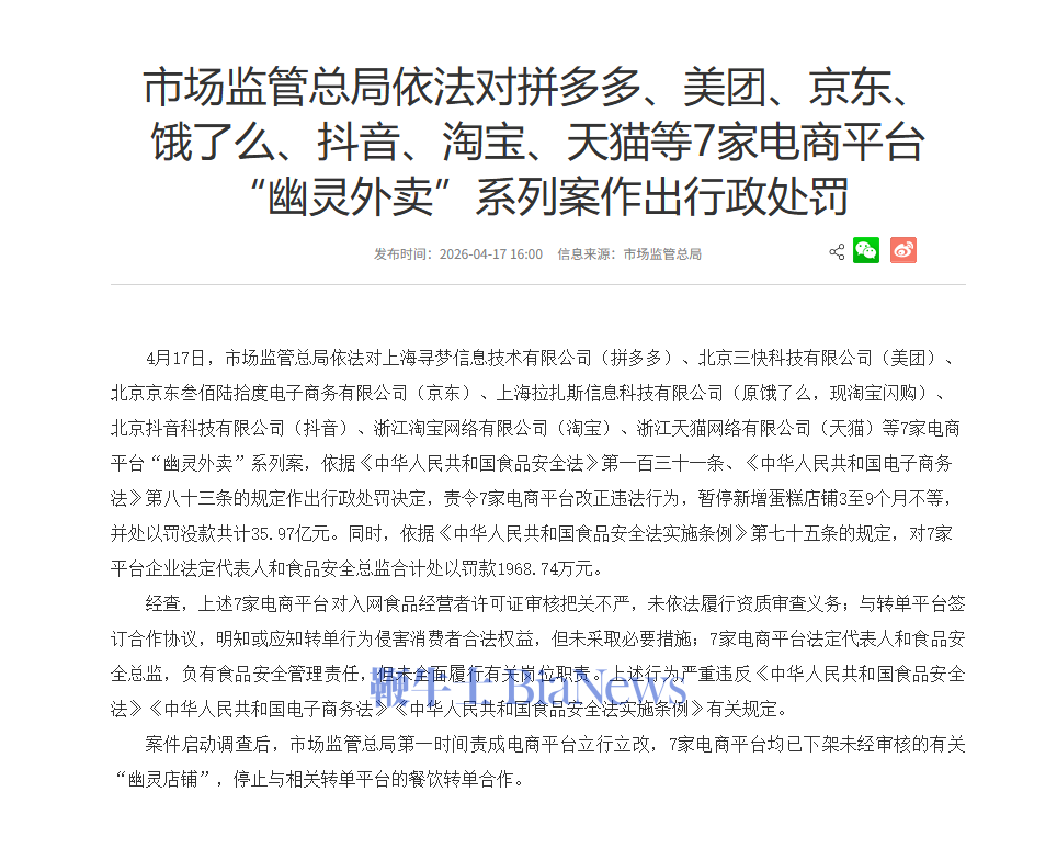4月17日,市场监管总局依法对上海寻梦信息技术有限公司(拼多多)、北京三快科技有限公司(美团)、北京京东叁佰陆拾度电子商务有限公司(京东)、上海拉扎斯信息科技有限公司(原饿了么,现淘宝闪购)、北京抖音科技有限公司(抖音)、浙江淘宝网络有限公司(淘宝)、浙江天猫网络有限公司(天猫)等7家电商平台“幽灵外卖”系列案,依据《中华人民共和国食品安全法》第一百三十一条、《中华人民共和国电子商务法》第八十三条
