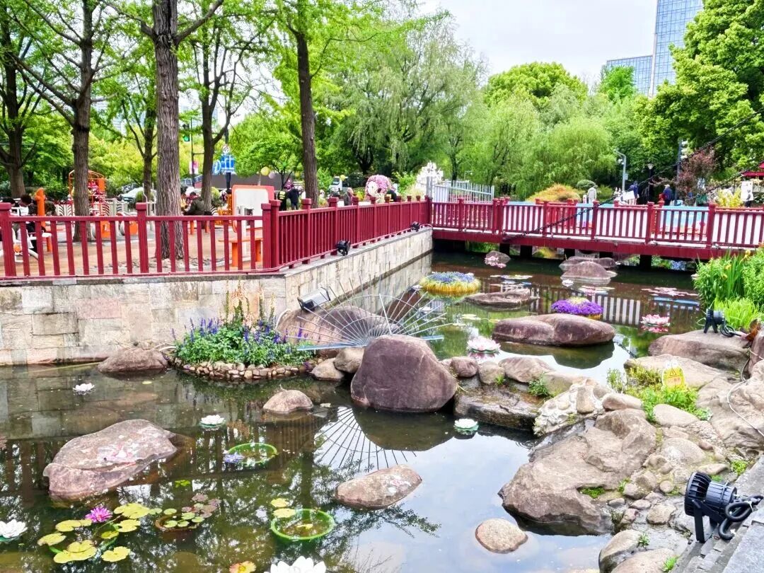 漫步黄浦区古城公园垂丝海棠的花瓣轻轻飘落在明代城墙斑驳的砖石上一丛丛蓝紫色鸢尾沿着溪流蜿蜒铺展仿佛是哪位画家在护城河畔打翻了调色盘而要说古城公园里最值得按下快门的角落,当属将共青森林公园“莫奈花园”基因巧妙“嫁接”于此的——“花溪寻踪”。 当“莫奈花园”遇见老城墙一场跨越时空的“花漾对话” 共青森林公园前身是黄浦江边的滩涂苗圃,历经六十余年涵养,才成就今日林海苍翠之貌。园中一处250平方米的河岸花