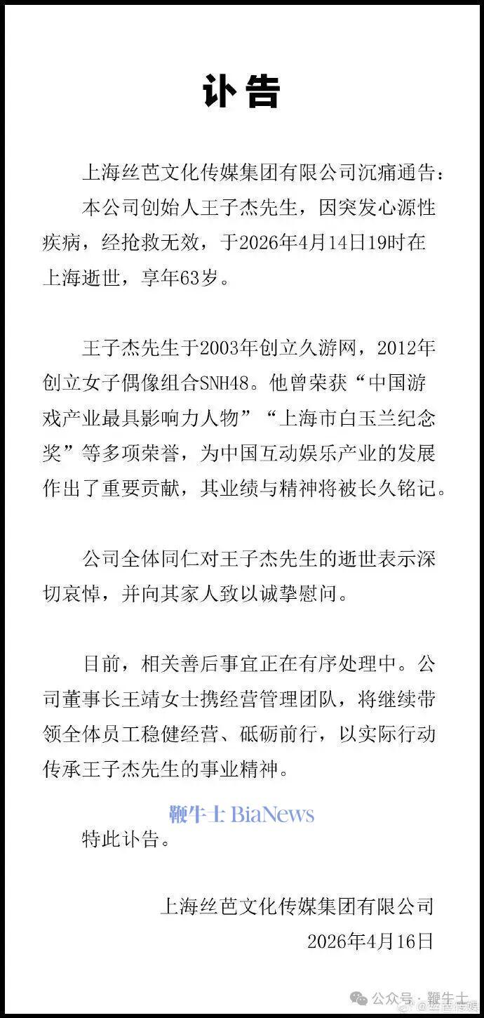 4月16日,上海丝芭文化传媒集团有限公司发布讣告,公司创始人王子杰先生,因突发心源性疾病,经抢救无效,于2026年4月14日19时在上海逝世,享年63岁。王子杰先生于2003年创立久游网,2012年创立女子偶像组合SNH48。他曾荣获“中国游戏产业最具影响力人物”“上海市白玉兰纪念奖”等多项荣誉。目前,相关善后事宜正在有序处理中。公司董事长王靖女士携经营管理团队,将继续带领全体员工稳健经营、砥砺前
