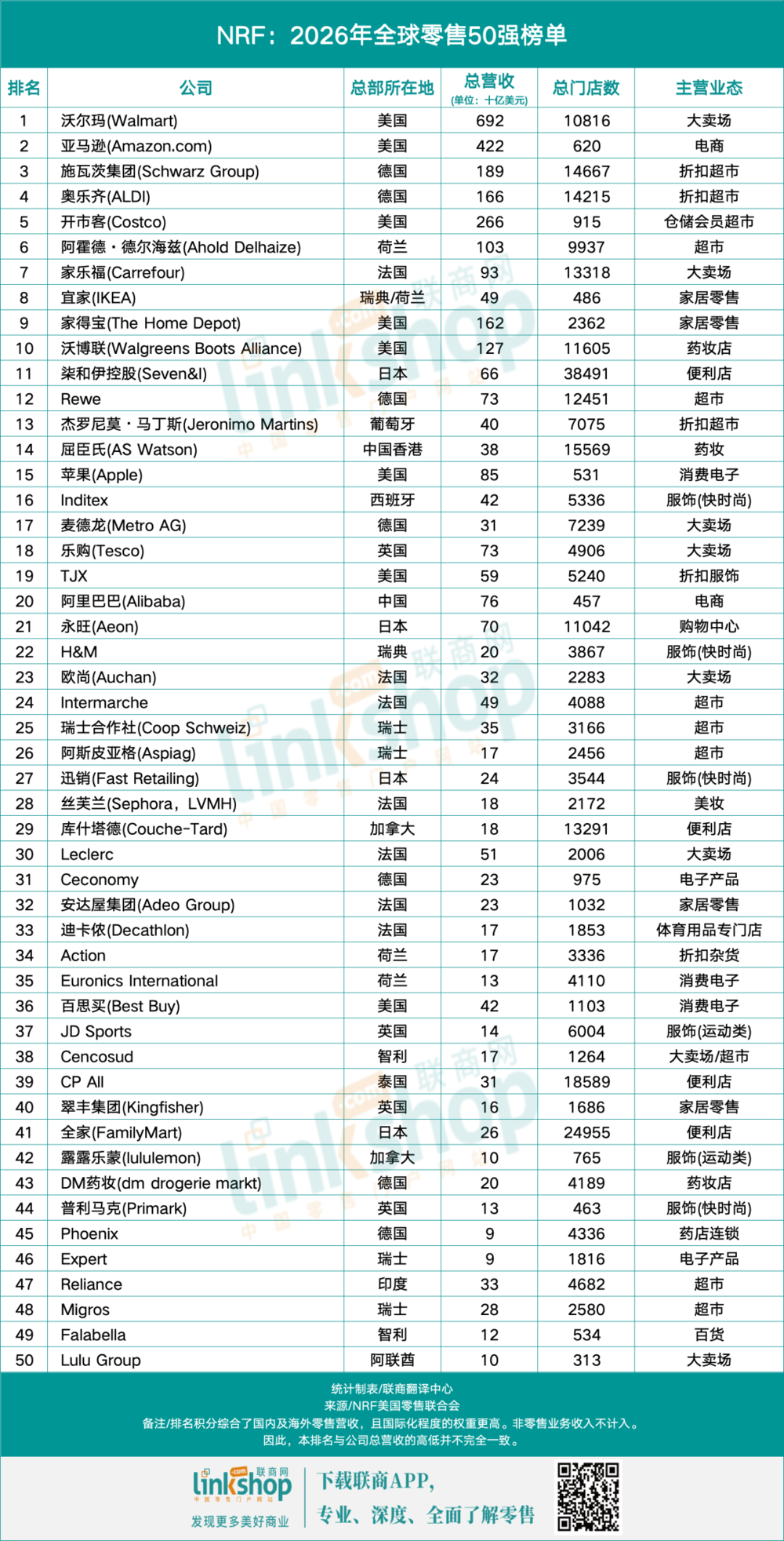 本文来自微信公众号: 联商网 ,编辑:李言,作者:联商网编辑部近日,美国零售联合会(NRF)联合凯度(Kantar)发布“2026年全球零售商TOP50榜单”。数据显示,2026年上榜企业总营收达3.57万亿美元(约合人民币25.70万亿元),同比增长2.50%;总门店数为30.87万家,同比减少11.71%,呈现“营收微增、门店收缩”的鲜明特征。从两届榜单变化中可以清晰观察到几大核心趋势:折扣零