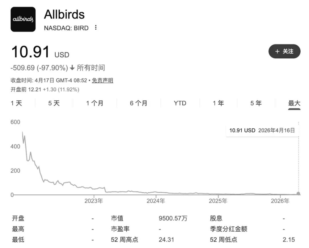 本文来自微信公众号: LADYMAX ,作者:Drizzie,原文标题:《深度 | Allbirds为何放弃运动鞋?》这一次Allbirds励志成为基础设施本身有些公司更擅长当一家初创企业。以硅谷标配著称的运动鞋公司Allbirds,在以3900万美元出售全部鞋履资产后,本周二宣布将转型为一家AI基础设施公司,并更名为NewBird AI。资本市场迅速狂热,其股价单日暴涨近600%,引发全球市场的