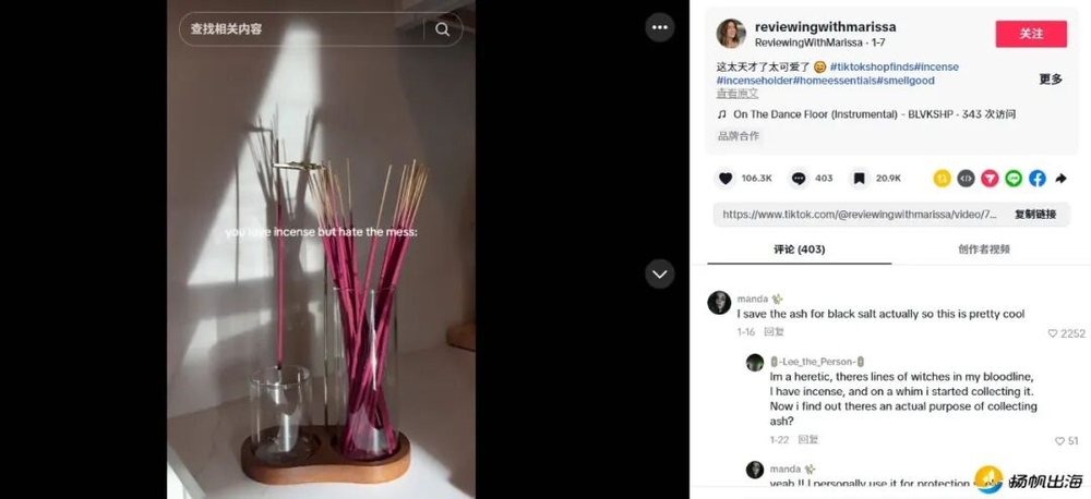本文来自微信公众号: 扬帆出海 ,作者:以南,编辑:火狐狸点香、静置、看着香灰缓缓落下。这根看似不起眼的中式线香,已成为疗愈海外年轻人的“神器”。2026年初,TikTok达人@ReviewingWithMarissa展示了一款设计独特的“倒置香插”。与传统平放不同,这款产品通过金属杆和金属夹,让线香处于悬挂状态,香灰则落在了木制底座中。既解决了香灰清理的麻烦,也形成了具有观赏性的视觉画面,精准契