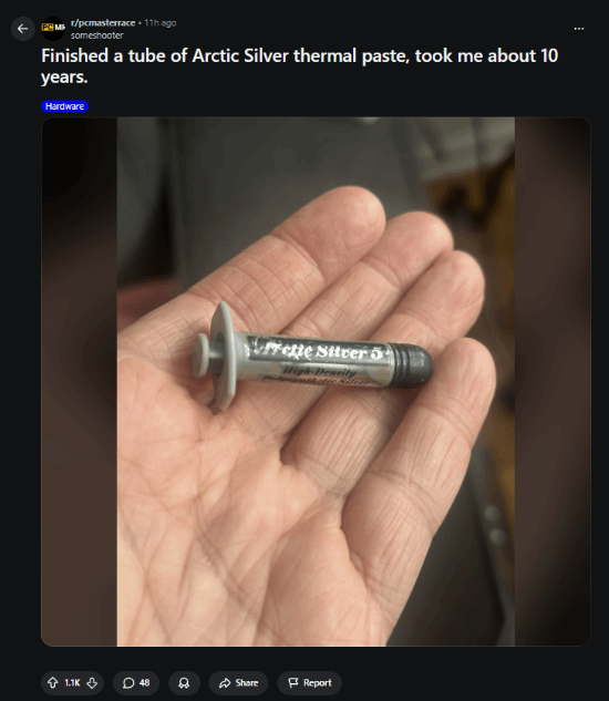 近日,Reddit上一则帖子引发玩家热议。一名用户晒出自己刚刚用完的一管Arctic Silver硅脂,并表示这管硅脂“用了大约10年才耗尽”。该帖引发许多网友共鸣与调侃。有玩家留言称:“我那管大概2005年买的,现在还有三分之一没用完。”也有人表示:“更让我震惊的是,你居然还能在十年后找到它——我总是买了新的才发现旧的还在。”还有网友询问这是否只是普通家用电脑处理器的硅脂,并表示如果是大核心面积