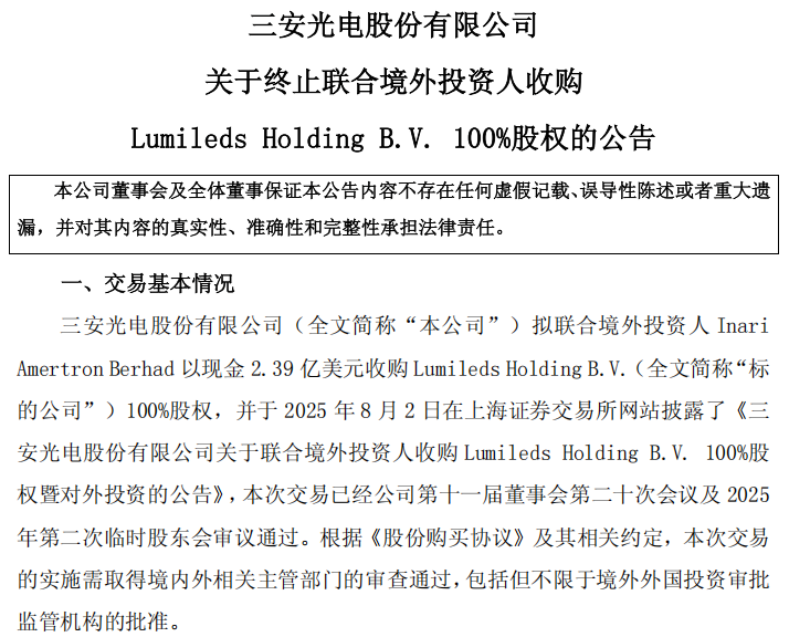 4月17日,三安光电公告,公司原拟联合境外投资人以2.39亿美元收购LumiledsHoldingB.V.100%股权。因美国外国投资委员会(CFIUS)认定该交易引发不可化解的美国国家安全风险,要求撤回申报并放弃交易,鉴于交割先决条件无法满足,交易各方已自愿放弃交易。公司及相关方在签署《股份购买协议》及相关文件后,就本次交易向美国外国投资委员会(以下简称“CFIUS”)等相关国家政府部门提交了审