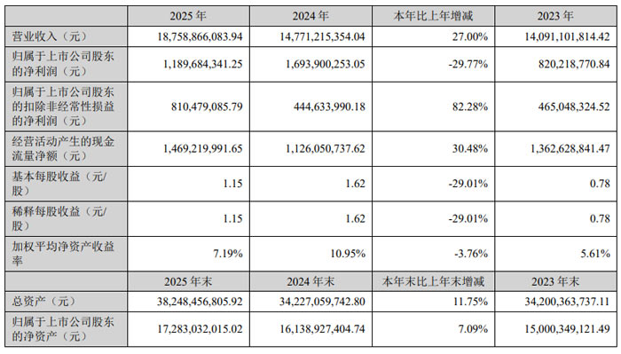 4 月 17 日,大族激光科技产业集团股份有限公司(股票代码:002008)披露 2025 年年度报告。报告期内,公司紧抓 AI 算力、消费电子、新能源、半导体等行业发展机遇,经营规模稳步扩大,全年实现营业收入187.59 亿元,同比增长27.00%;扣除非经常性损益后的净利润8.10 亿元,同比大幅增长82.28%,经营质量与盈利能力持续优化。经营业绩稳步攀升 现金流表现亮眼 2025 年,大族