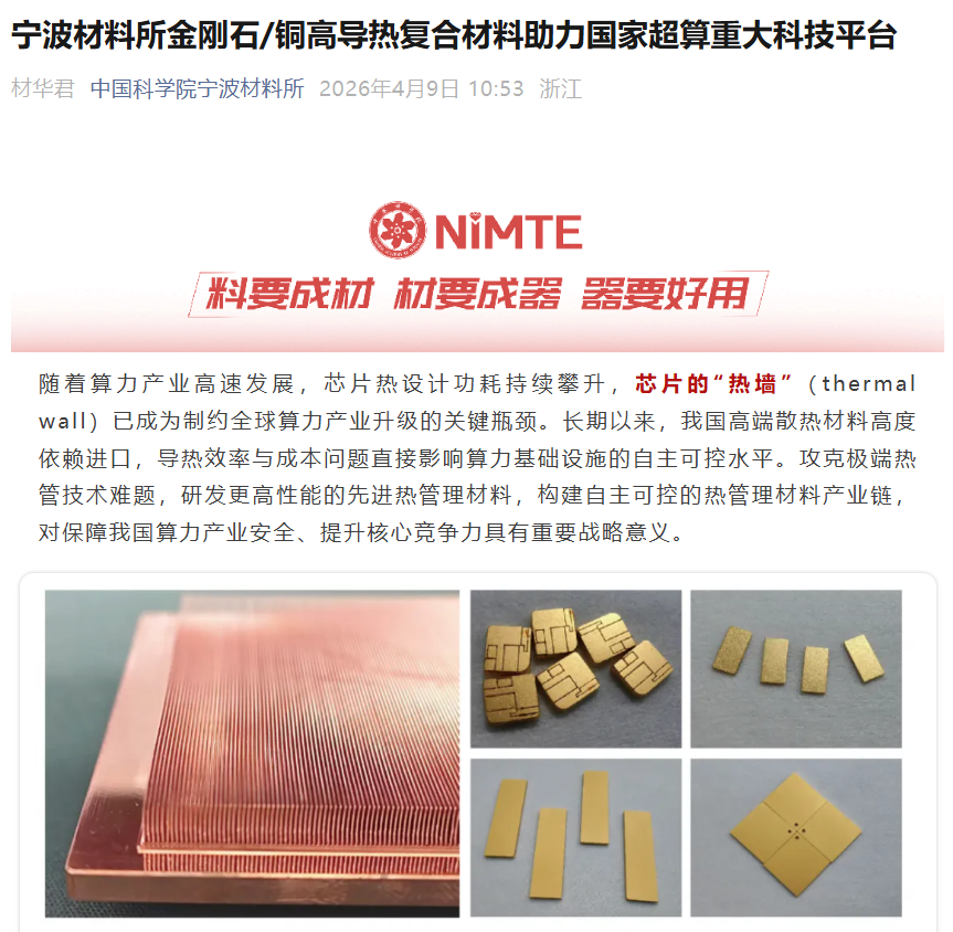 IT之家 4 月 14 日消息,据中国科学院宁波材料所 4 月 9 日消息,面向国家重大需求,该所功能碳素材料团队依托自主研发的高效率 3D 复合技术与规模化制备工艺,通过“基础研究 — 中试验证 — 产业推广”全链条布局,系统攻克了金刚石铜复合材料在“分散难”“加工难”“表面处理难”等方面的制造卡点,成功研制出热导率突破 1000W/mK 的金刚石铜复合材料,在导热率、热膨胀匹配及加工精度等关键