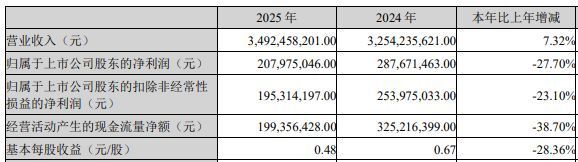 每经记者:蔡鼎 每经编辑:张益铭百亚股份(SZ003006,股价16.66元,市值71.58亿元)4月17日晚间披露2025年年报,公司2025年实现营收约34.92亿元,同比增长7.32%;实现归母净利润约2.08亿元,同比下降27.7%;实现扣非净利润约1.95亿元,同比下滑23.1%;基本每股收益0.48元,同比下滑28.36%。这意味着,百亚股份2025年出现“增收不增利”的情况。公司拟每