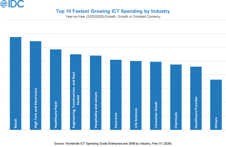 IDC最新预测显示,2026年亚洲太平洋地区(不含日本和中国)的ICT支出将达到6470亿美元,同比增长5.4%,并在2029年进一步超过7580亿美元。按这一轨迹计算,未来三年该区域ICT市场仍将保持较高景气度,2026年至2029年的复合年增长率预计高于7.4%。这意味着亚太ICT需求已不再是单纯的周期性回升,而是进入由AI、数据治理与安全体系共同驱动的中长期扩张阶段。从支出结构看,软件仍是最