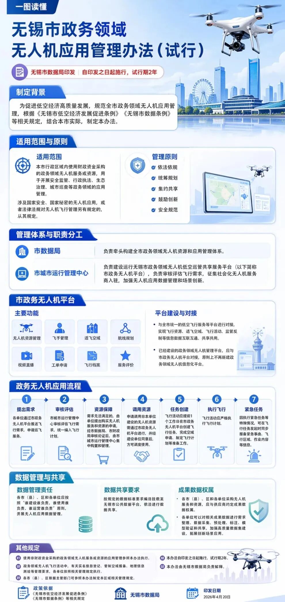 请将「低空经济观察」设为星标方能收到正常推送■ 「低空经济观察」从无锡市数据局获悉,《无锡市政务领域无人机应用管理办法(试行)》(以下简称《办法》)近日印发,以制度创新破题,推动政务无人机管理从“各自建”向“一网管”、从“分散飞”向“集约用”、从“零散存”向“共享用”,着力构建全域统筹、高效协同、安全可控的政务低空治理新体系。《办法》明确,市数据局牵头统筹全市政务无人机资源与应用管理体系,市城运中