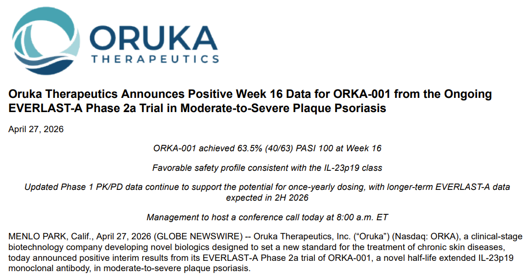 ▎Armstrong2026年4月27日,Oruka Therapeutics公布长效IL-23抗体ORKA-001治疗中至重度斑块型银屑病的2a期临床EVERLAST-A最新临床数据。Oruka Therapeutics当天股价涨11%,目前市值为38亿美元。Oruka Therapeutics聚焦研发银屑病类疾病的迭代长效抗体药物,包括长效IL-23抗体、长效IL-17A/F抗体等。的EVER