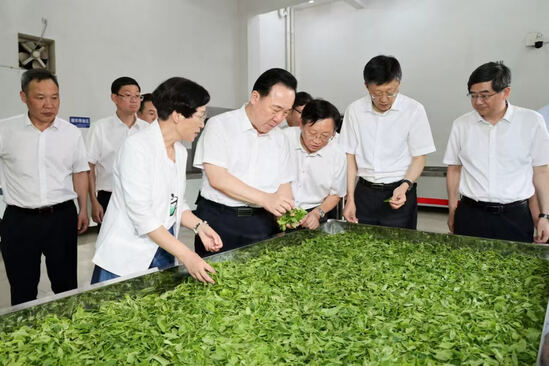 7月9日,在千岛湖龙冠茶叶有限公司,王浩深入车间察看制茶工艺流程,详细询问名优茶种植推广、品牌建设等情况。记者 李震宇 摄9日至10日,省委书记王浩在杭州淳安县调研。他一路访农家、问民生,谋项目、看产业,并主持召开专题会议,与杭州市、省直有关单位一起研究支持淳安高质量发展工作,推动全省山区海岛县高质量发展工作部署加快落地。王浩强调,要深入学习贯彻习近平总书记关于共同富裕的重要论述和考察浙江重要讲话