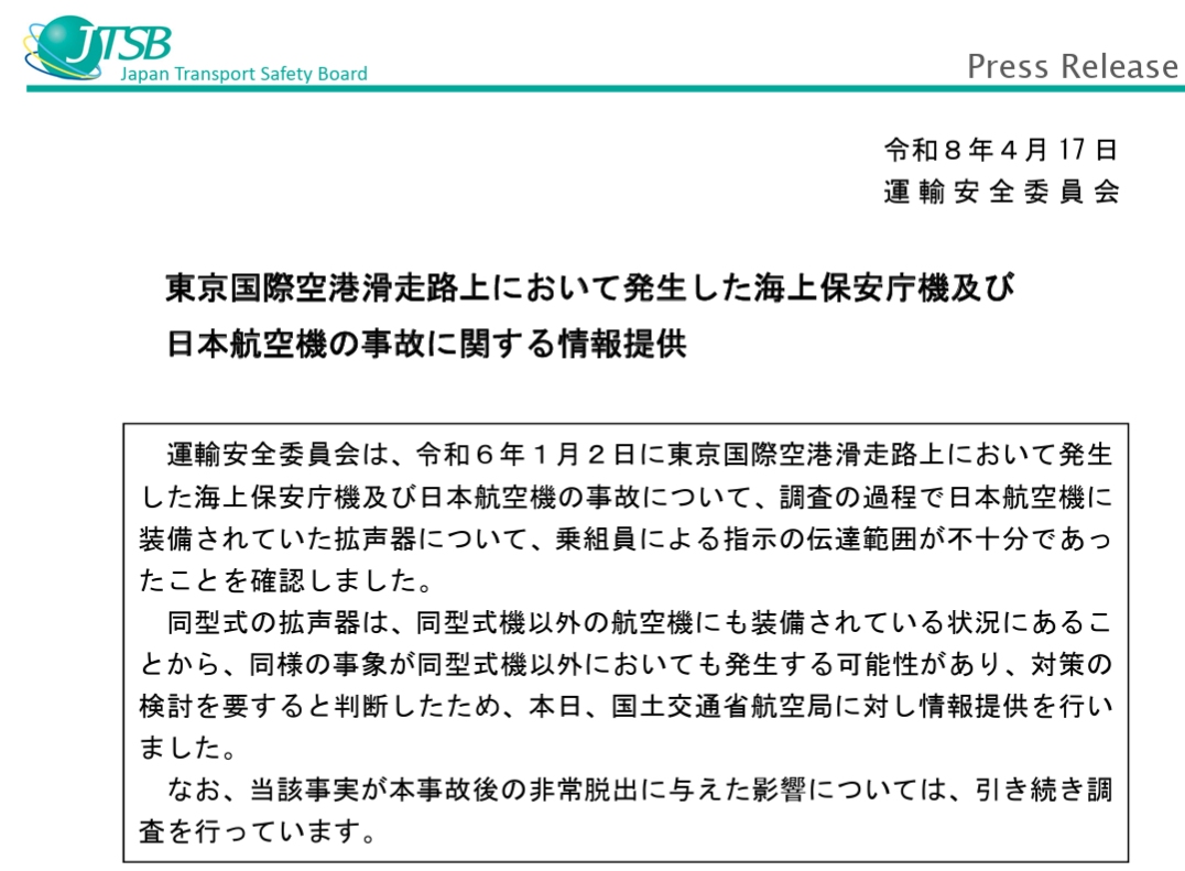 日前,日本运输安全委员会向日本国土交通省提交了最新报告。报告指出,2024年1月2日,日本海上保安厅飞机与日本航空一架A350客机在羽田机场相撞事故中,日航A350飞机所配备的扩音器有效覆盖范围不足。 报告称,事故发生后,日航A350客机的机上广播系统无法正常工作,机组人员转而使用扩音器呼叫乘客疏散。然而,扩音器的声音难以听清,部分乘客只能依靠观察他人的行动来进行疏散。部分乘务员在使用扩音器后发现