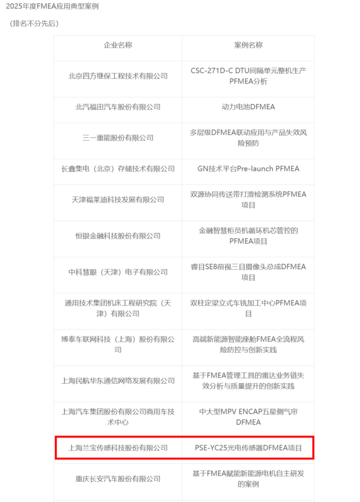 兰宝传感以DFMEA创新实践获质量领域认可在近期由京津沪渝等八省(直辖市)市场监督管理局联合发布的2025年度产品质量可靠性创新实践与FMEA应用典型案例名单中,上海兰宝传感科技股份有限公司凭借“PSE-YC25光电传感器DFMEA项目”成功入选FMEA应用典型案例,荣获质量创新领域的重要奖项。此次入选不仅体现了兰宝在质量管理和可靠性工程方面的深厚积累,也凸显了企业在传感器产品开发中对高可靠性目标