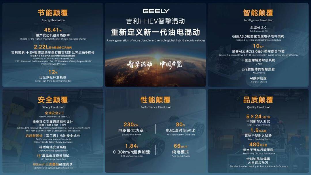 吉利汽车集团近日正式推出全球新一代AI油电混动技术——i-HEV智擎混动,以“五大颠覆”技术革新重塑油电混动市场格局。这项技术通过全域AI 2.0赋能,实现了智能、节能、性能、安全与可靠性的全面突破,不仅向丰田混动技术发起挑战,更标志着中国品牌在混动领域进入智能化引领的新阶段。在技术核心指标上,吉利i-HEV智擎混动展现出显著优势。其发动机热效率达48.41%,创下全球量产最高纪录,并获得中汽中心