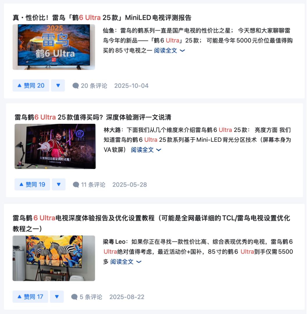 继去年鹤6 Ultra 25款凭借“全能水桶机”定位在市场端交出亮眼答卷后,雷鸟在2026年鹤系品鉴会上正式发布了鹤6 Ultra 26款。作为雷鸟鹤系中承上启下的口碑担当,鹤6 Ultra 26款延续了上一代“最具质价比高端QD-Mini LED电视”的产品定位,在画质、音响、系统体验等多个维度实现了稳健升级,且首发定价策略保持克制,做到了典型的“加量不加价”。 口碑回顾:鹤6 Ultra系列为